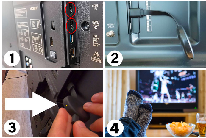 Just like you plug a USB stick into a computer, here you simply plug the box into the HDMI port of the TV.